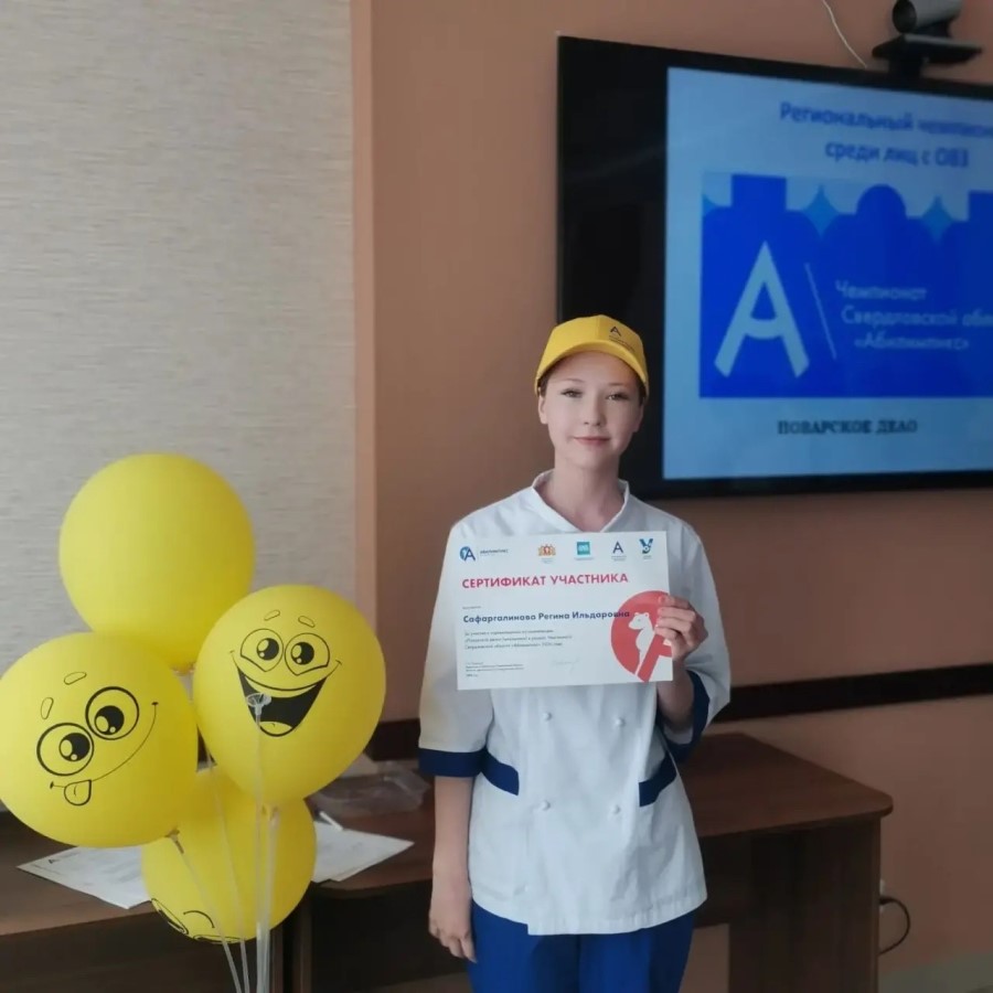 Регина Сафаргалинова, ученица 8-А класса, участвовала в соревнованиях по компетенции «Поварское дело» . Её задача — приготовить холодную закуску «Бутербродный Бенто-торт» и зразы картофельные с начинкой, подать с томатным соусом . В процессе работы Регина строго соблюдала все санитарные нормы и технологические правила обработки продуктов, демонстрируя отличные навыки и творчество в авторской импровизации .