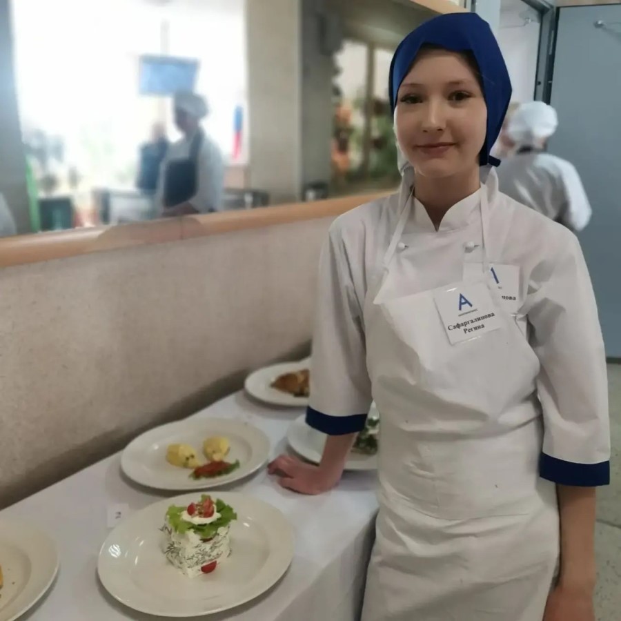 Регина Сафаргалинова, ученица 8-А класса, участвовала в соревнованиях по компетенции «Поварское дело» . Её задача — приготовить холодную закуску «Бутербродный Бенто-торт» и зразы картофельные с начинкой, подать с томатным соусом . В процессе работы Регина строго соблюдала все санитарные нормы и технологические правила обработки продуктов, демонстрируя отличные навыки и творчество в авторской импровизации .