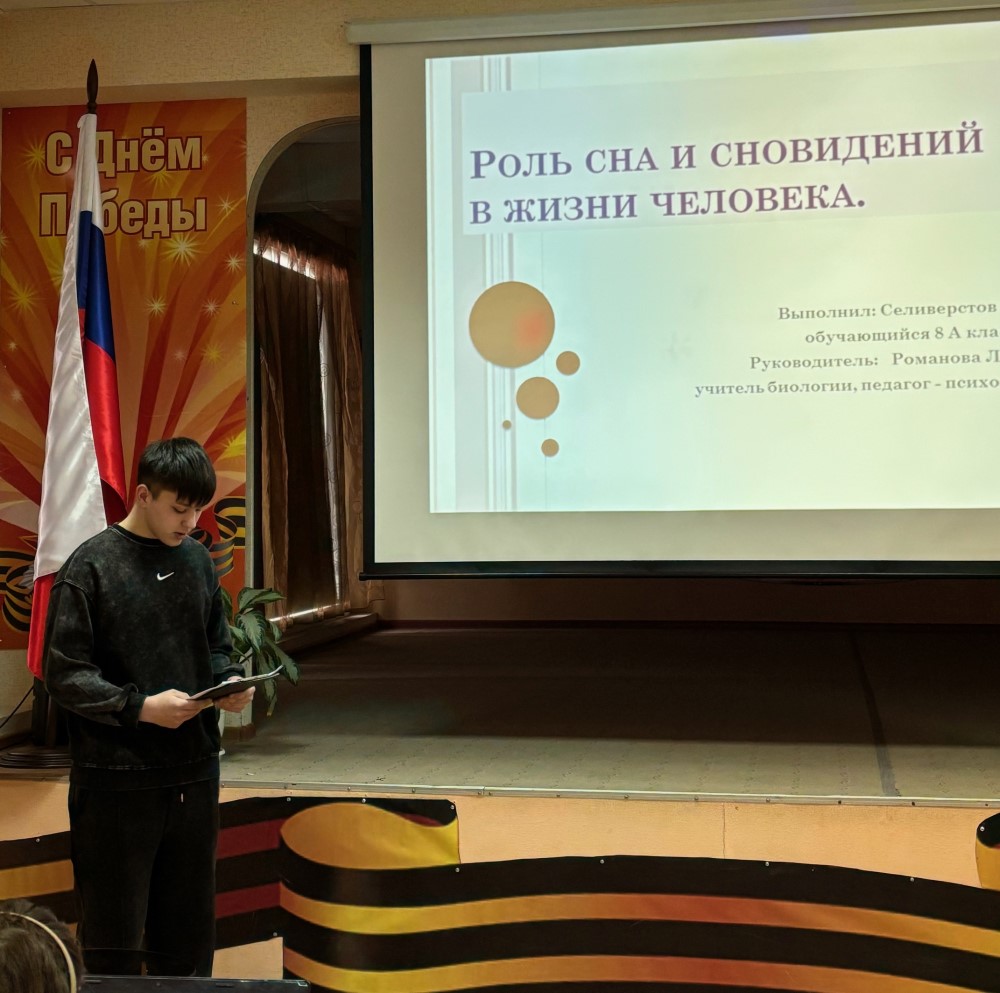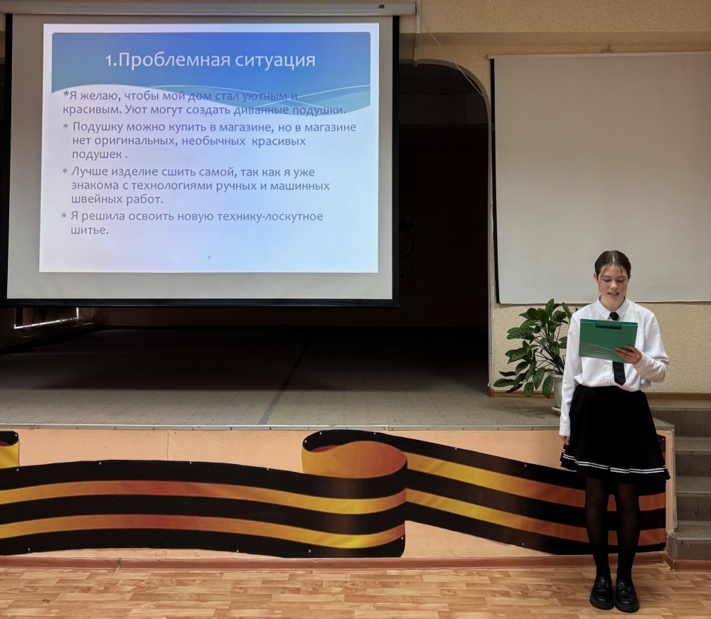 Навыки исследовательской деятельности продемонстрировали обучающиеся 8-х и 9 -х классов в своих проектах «Выращивание картофеля в вазоне в зимнее время», «Роль сна и сновидений в жизни человека». О своем профессиональном самоопределении рассказала Анастасия Ч. в проекте «Профессия «Швея». Трогательными были работы ребят, посвященные юбилею Великой Победы в ВОВ : Артем С. рассказал о работе над проектом «Мой прадед – мой герой!», Валерия К. представила свой творческий проект «Вечный огонь».