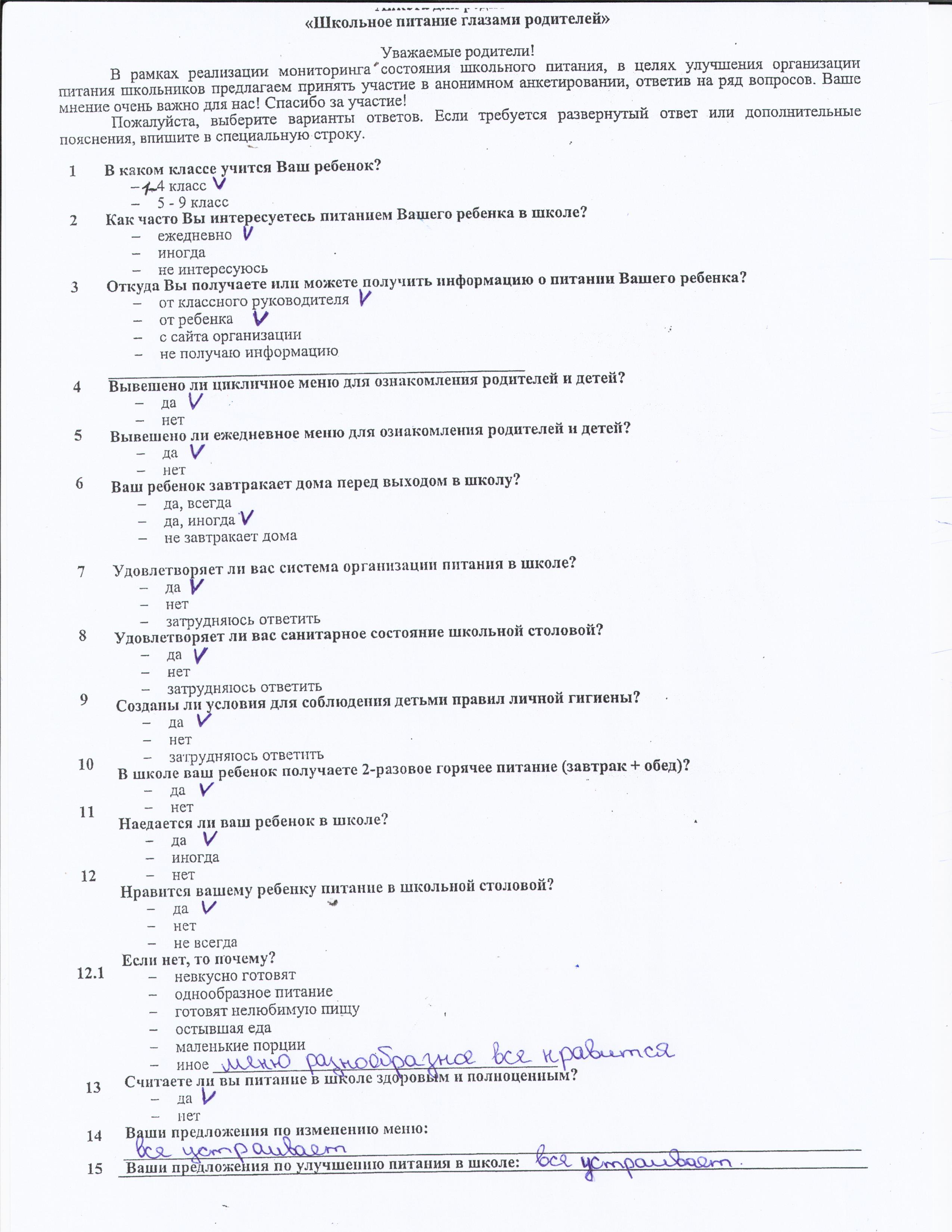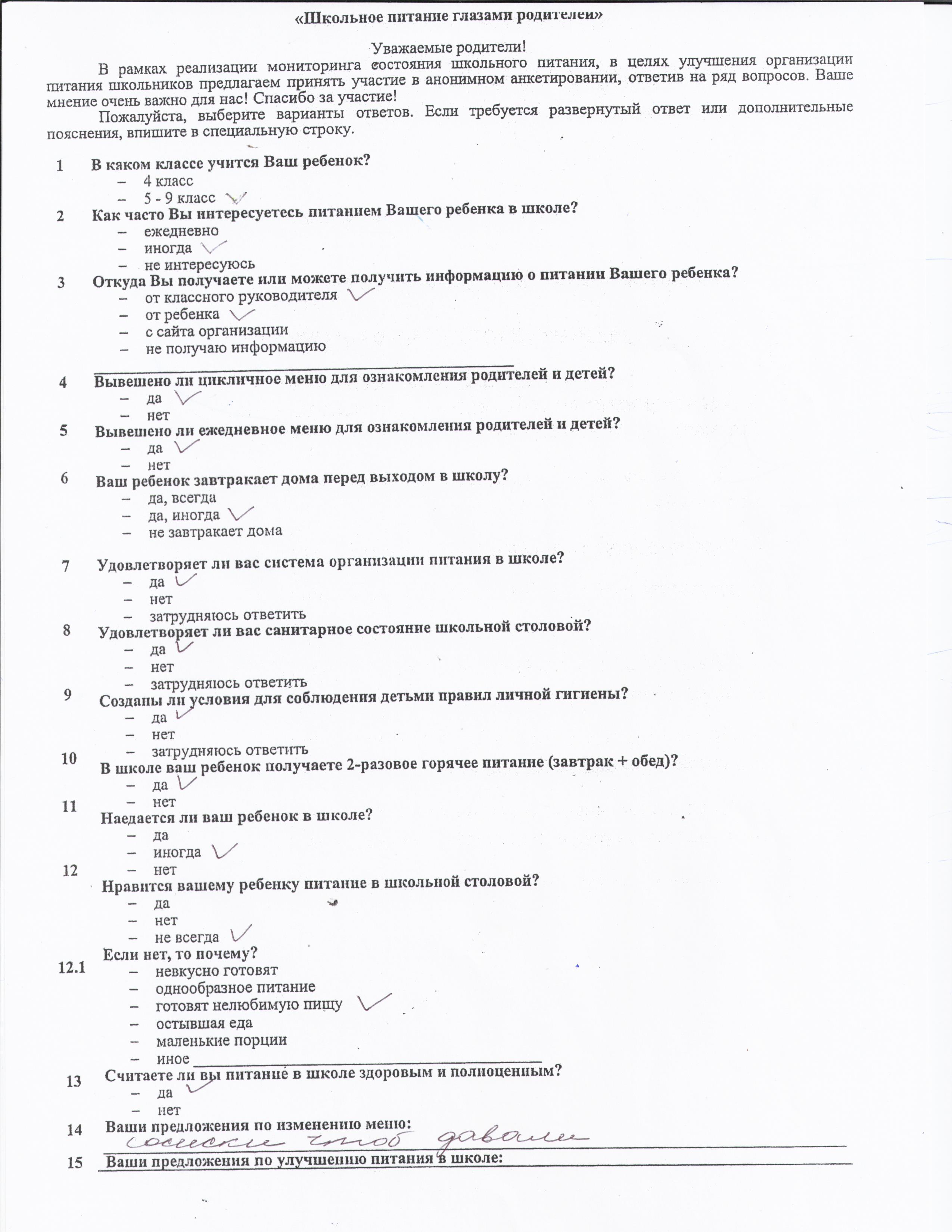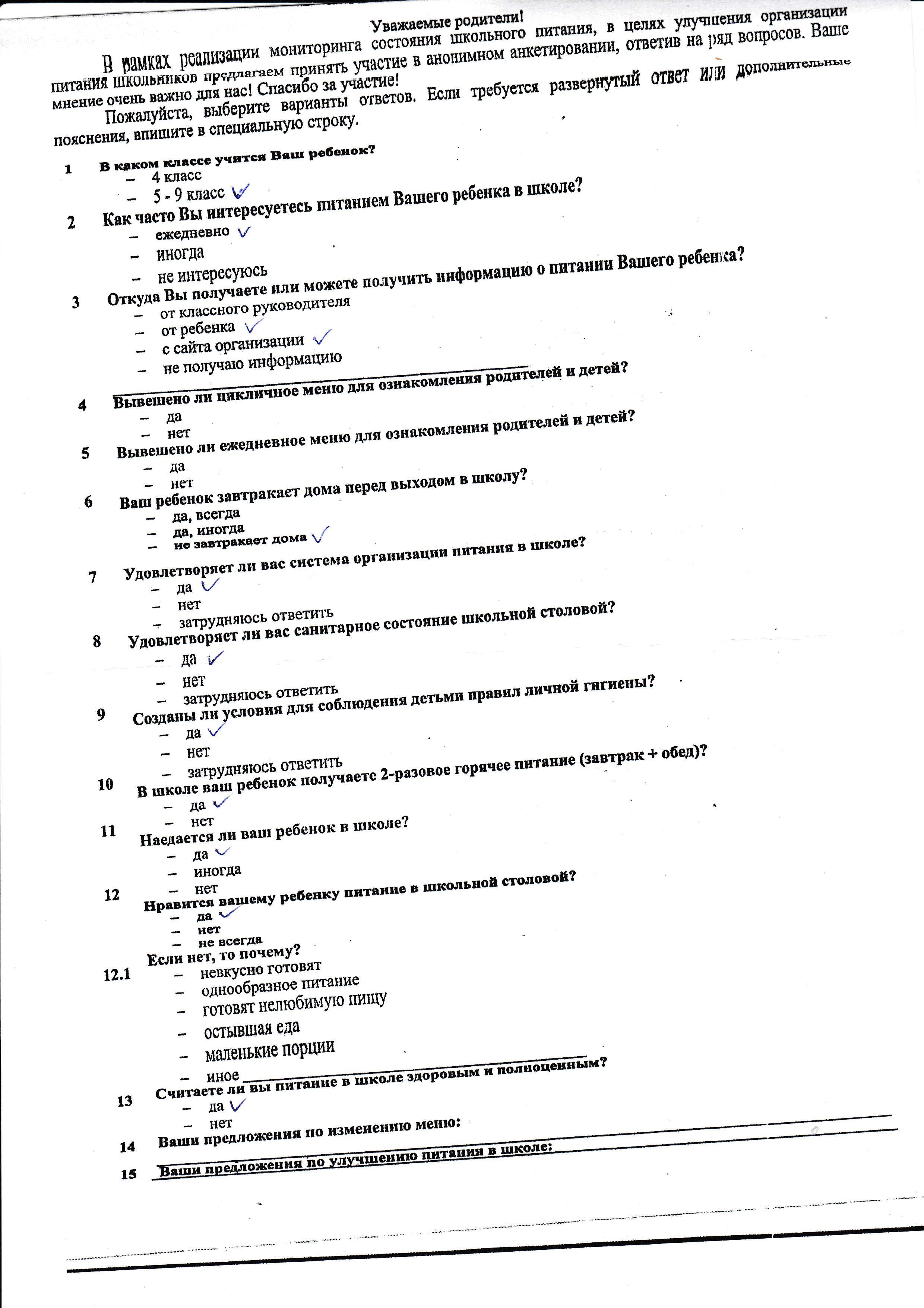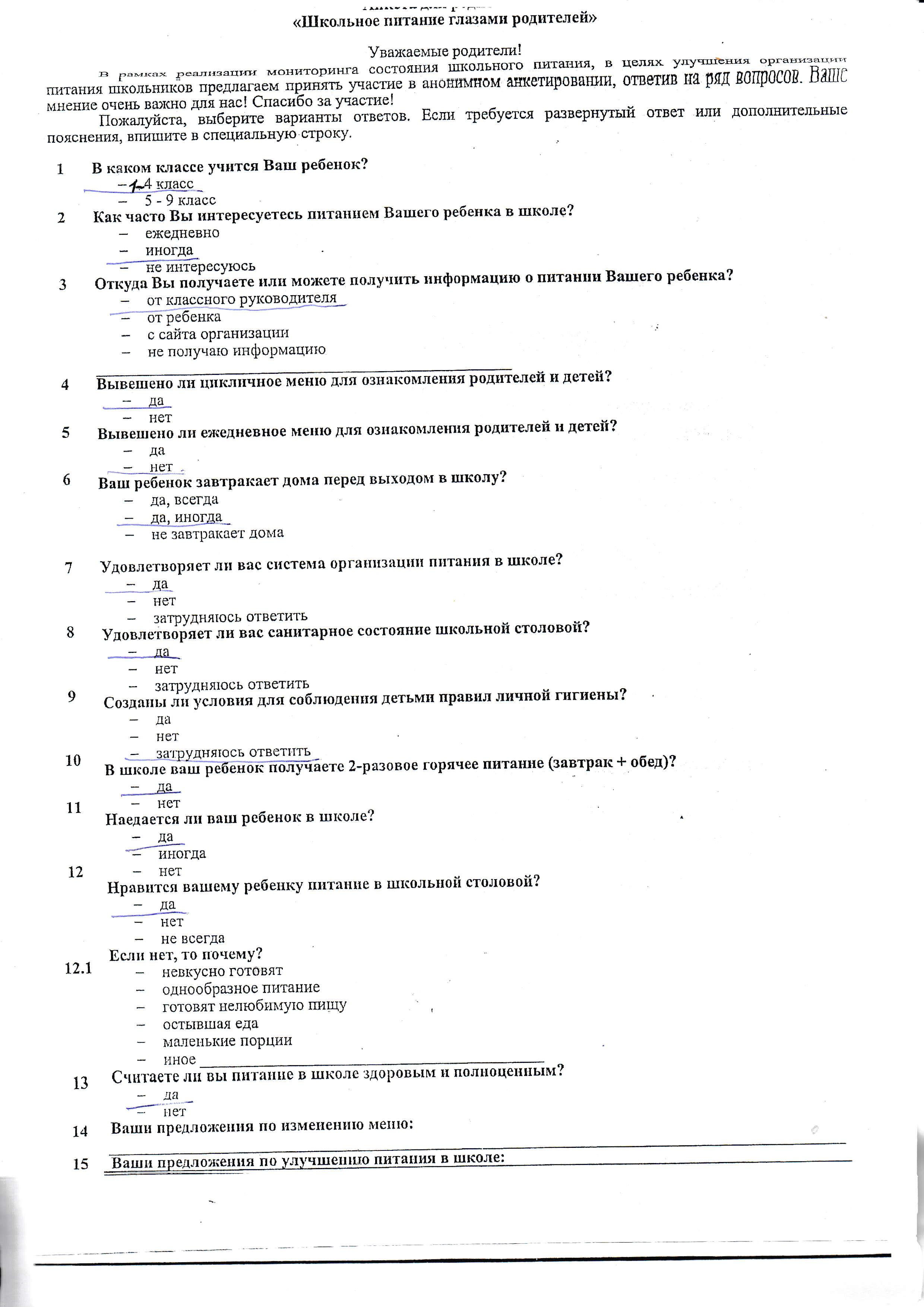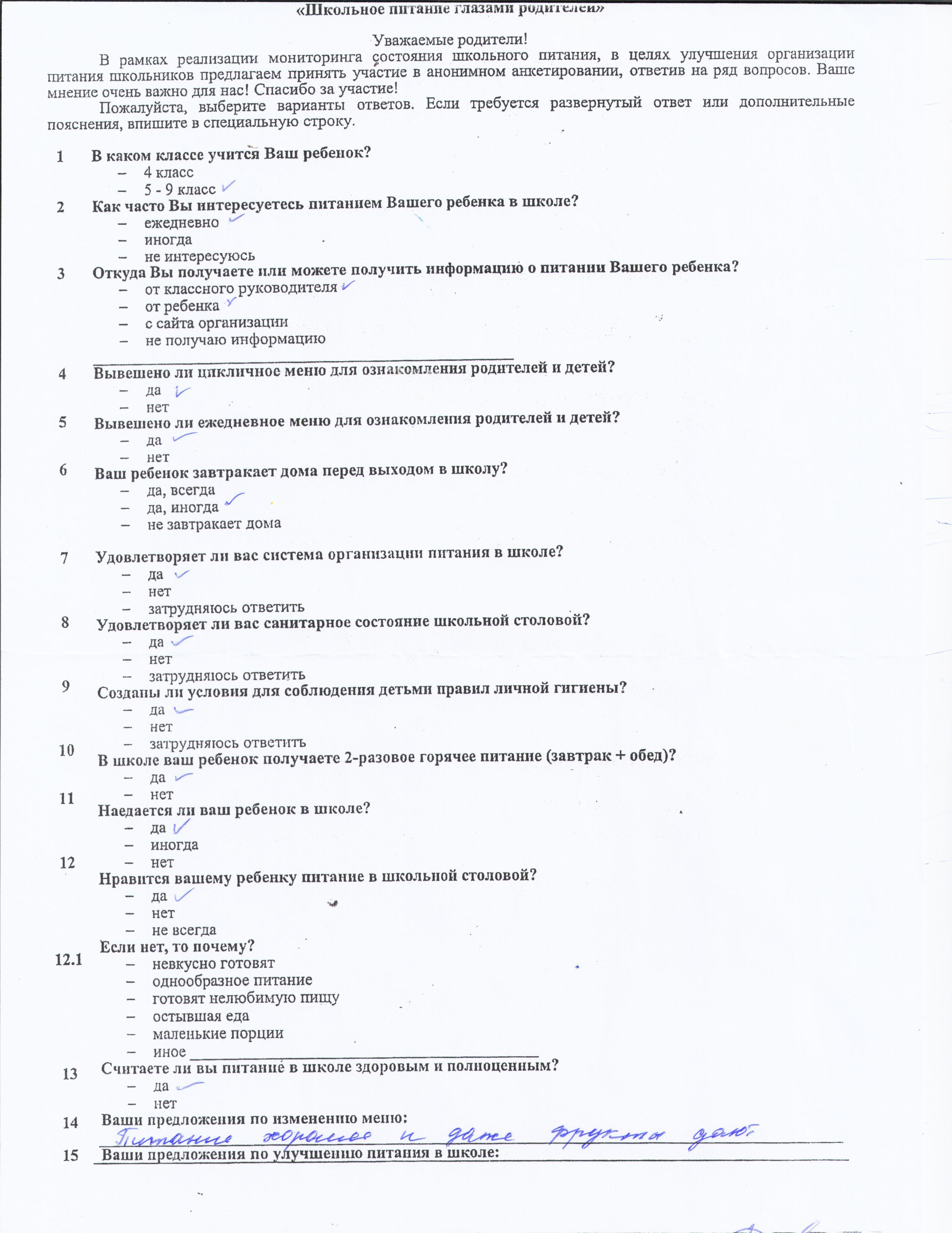 Проведен анализ анкет родителей в рамках мониторинга школьного питания, в целях улучшения организации питания школьников учреждения в декабре 2025 года.