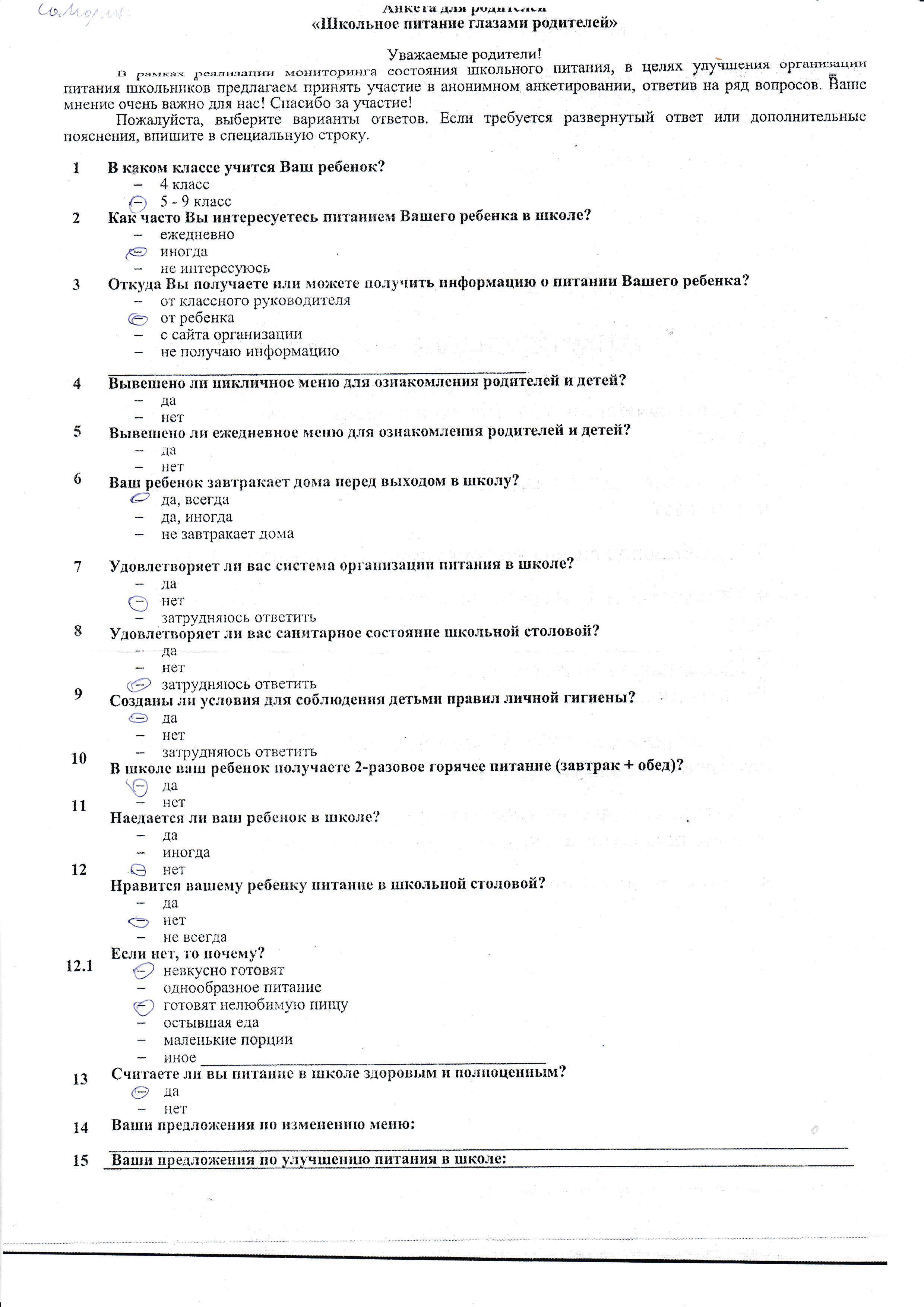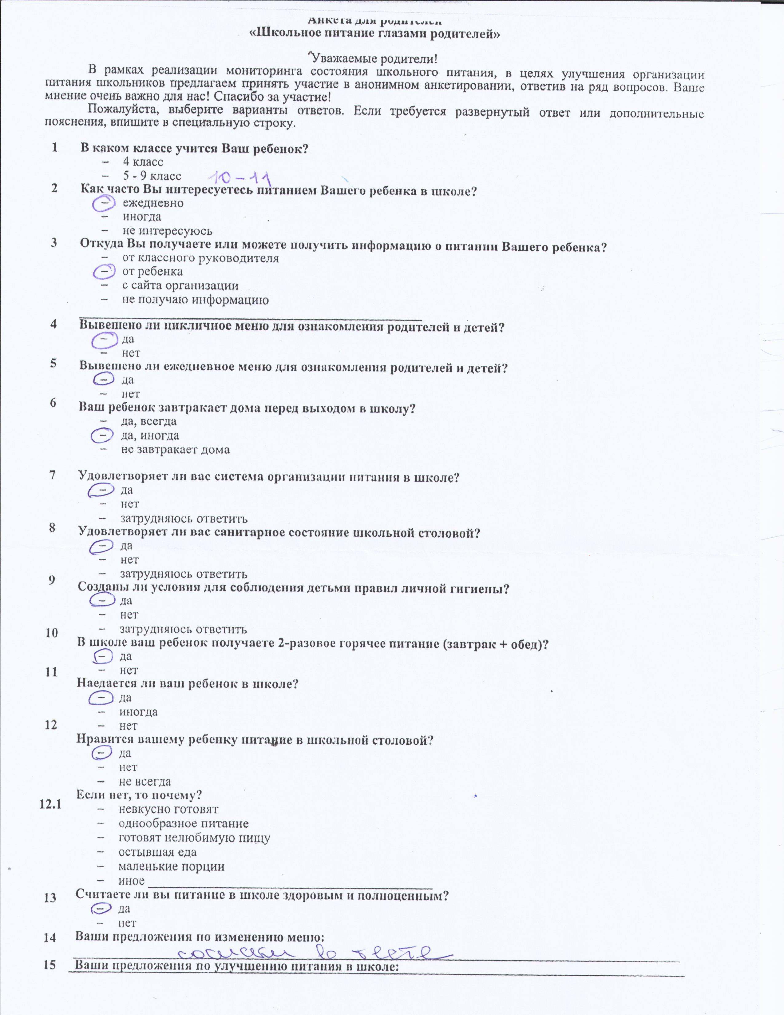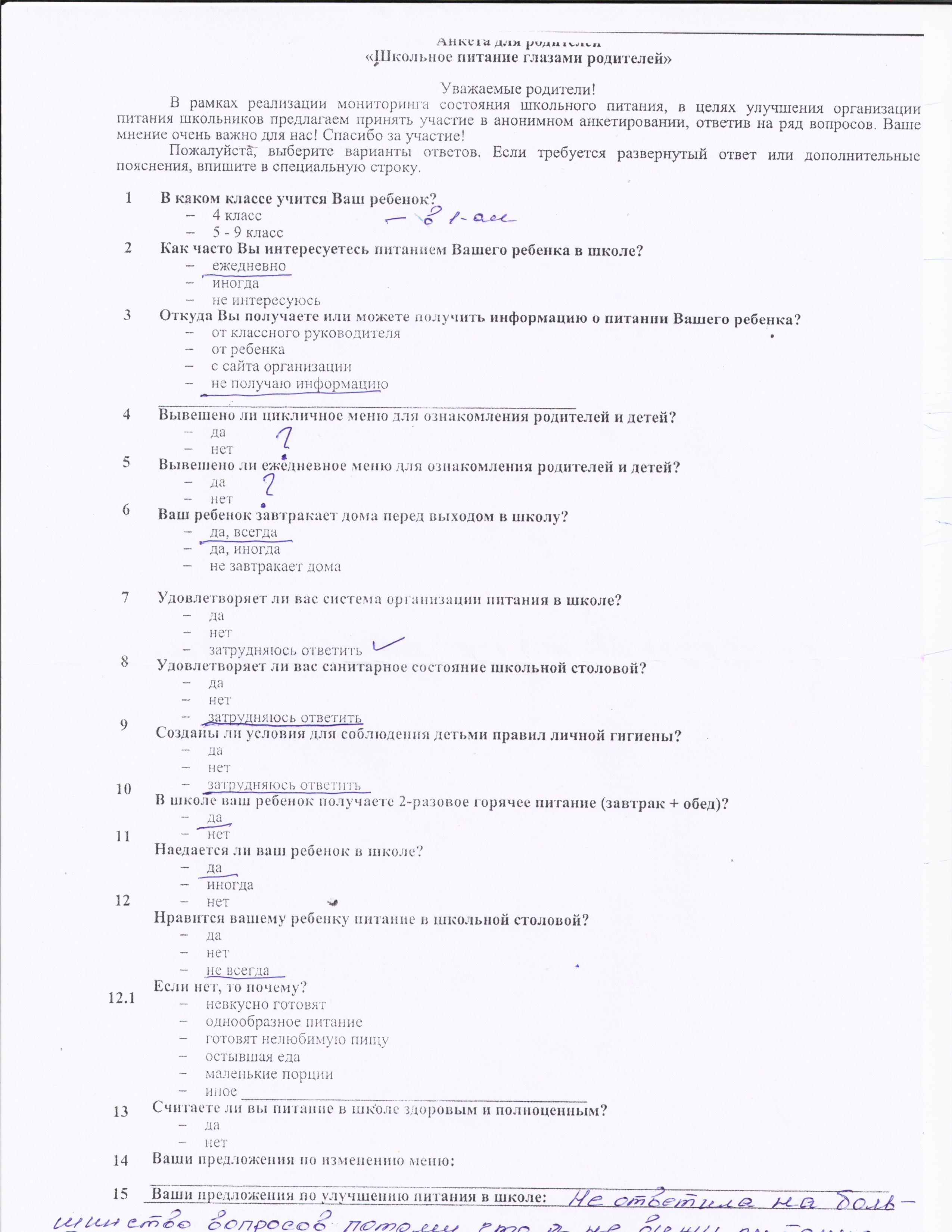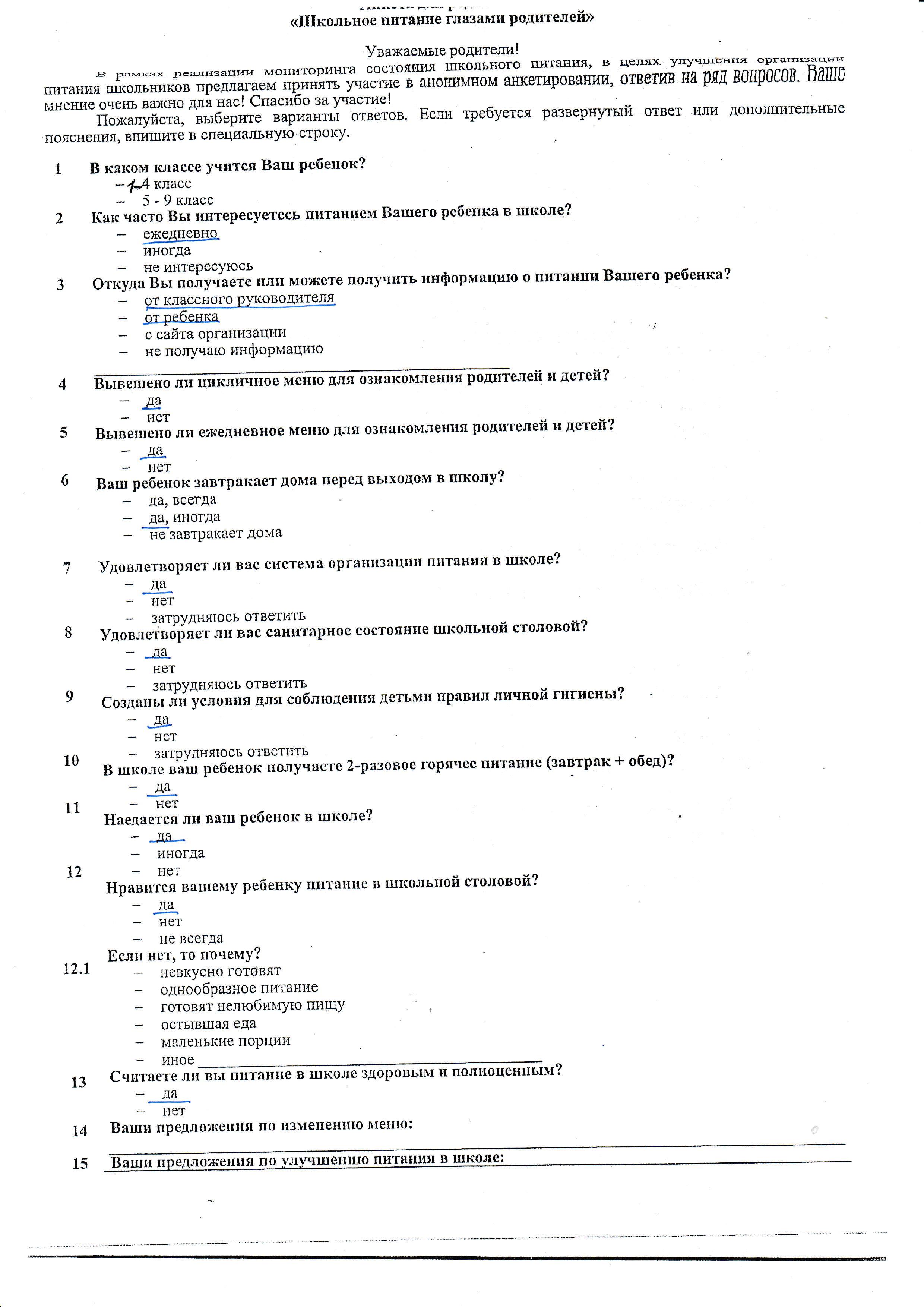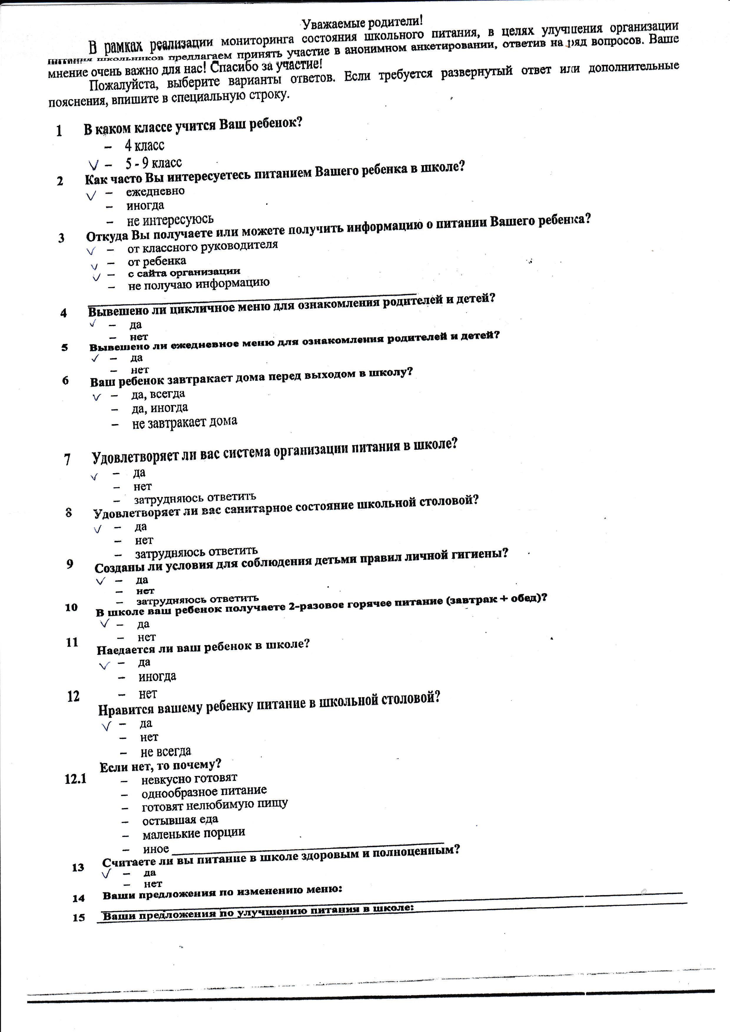 Проведен анализ анкет родителей в рамках мониторинга школьного питания, в целях улучшения организации питания школьников учреждения в декабре 2025 года.