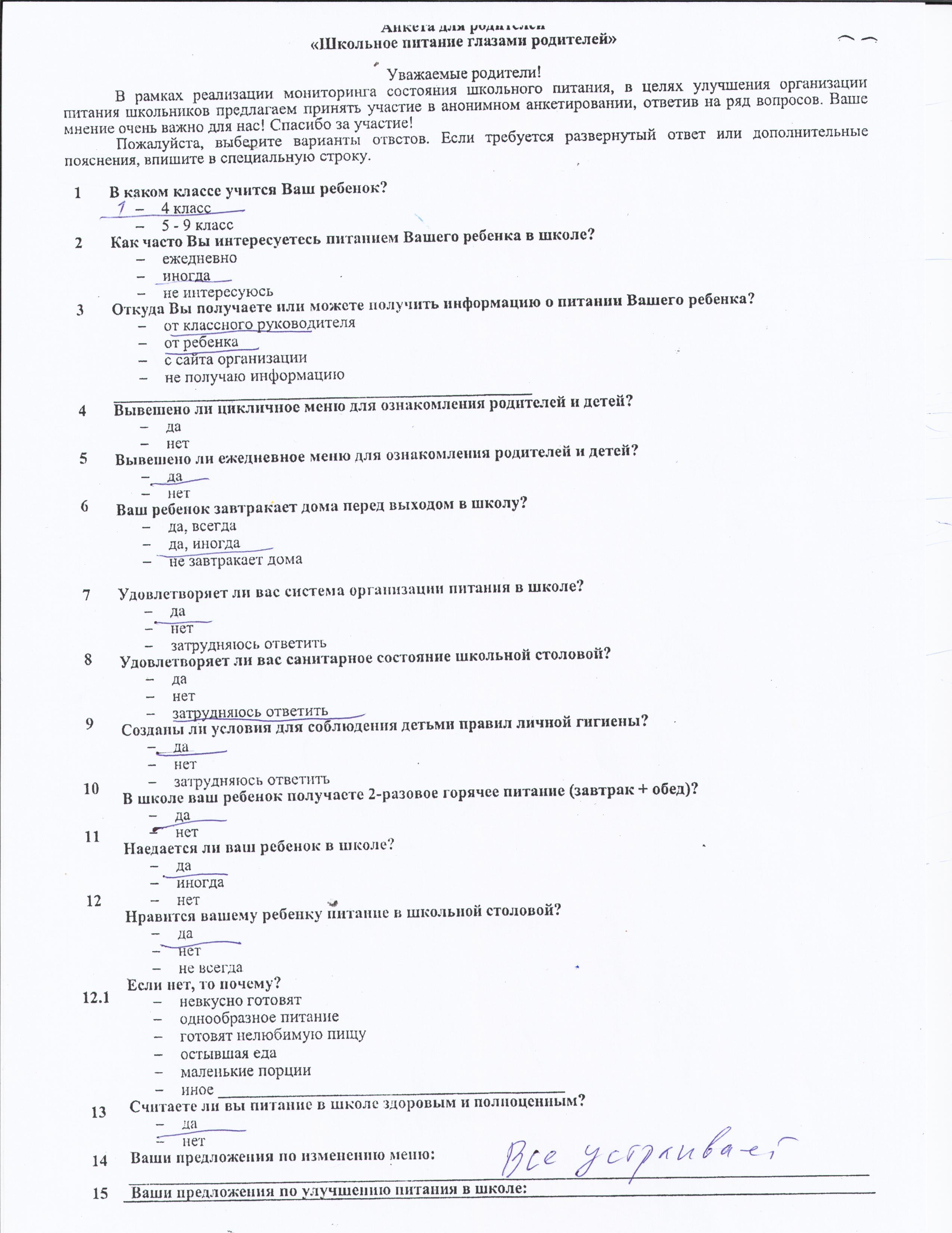 В анкетировании приняло 100% родителей учащихся 1-4 классов. Были выявлены пожелания родителей по улучшению питания детей в школьной столовой