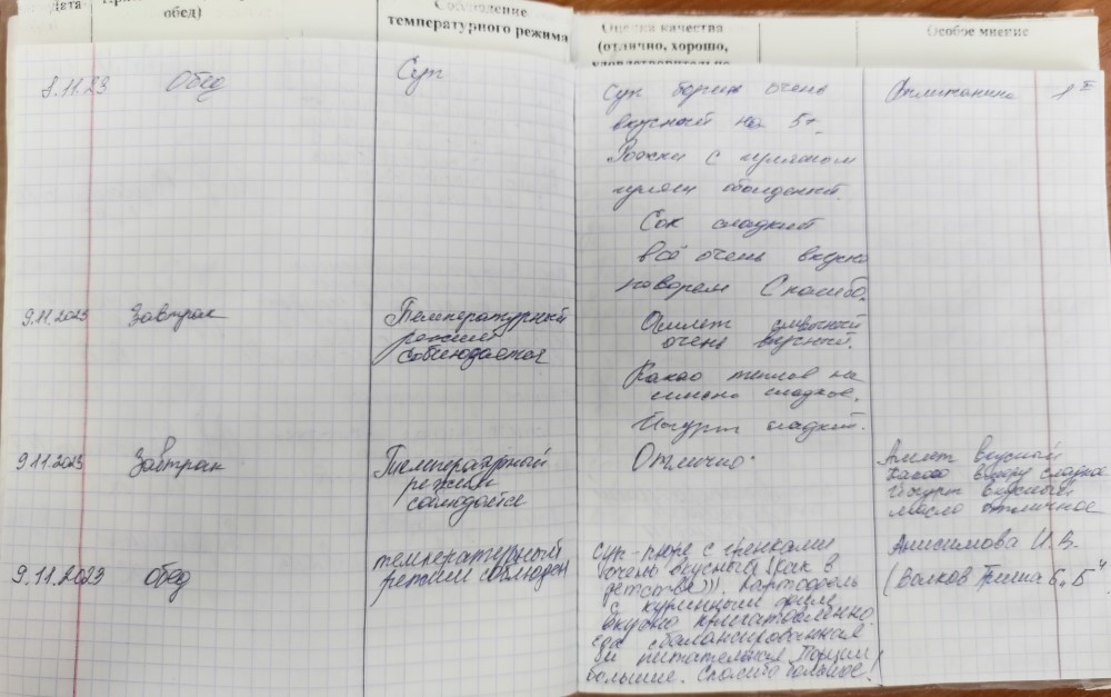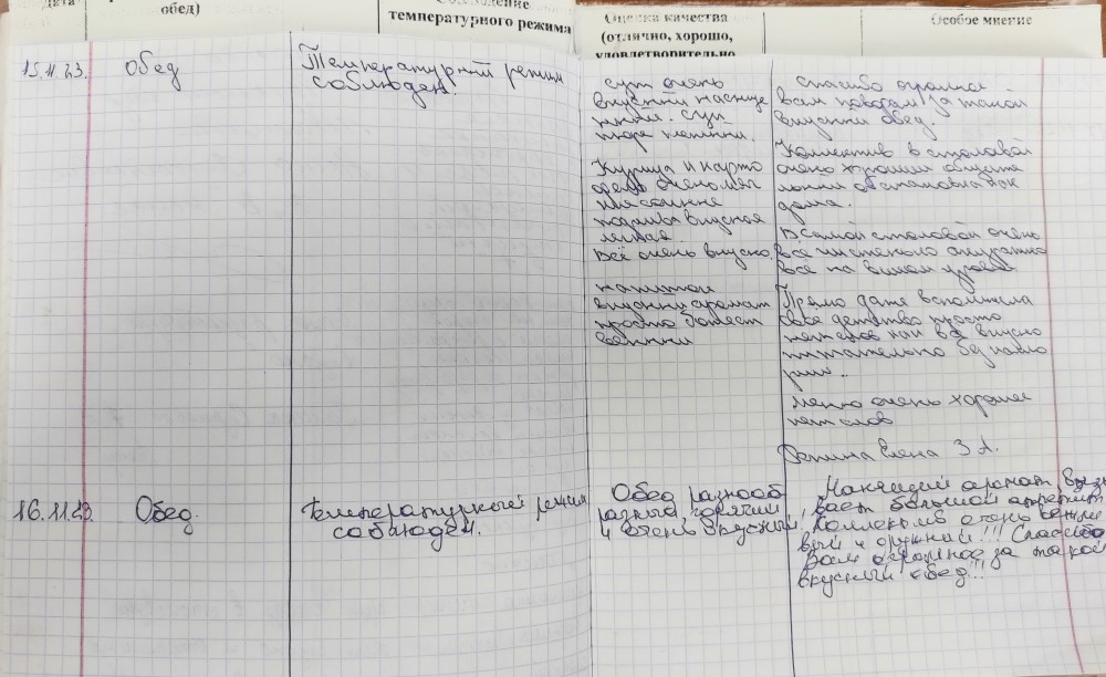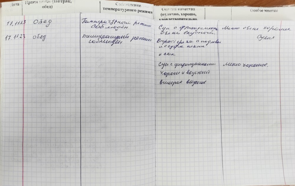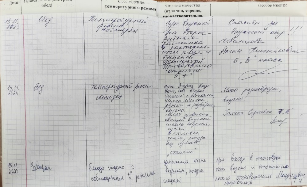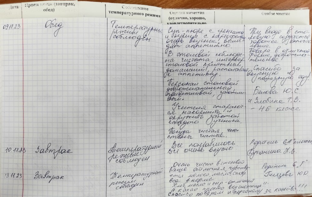 В образовательном учреждении проводится смотр организации и качества питания. Родители классов посещают приемы и в утвержденном журнале пишут отзывы. За 10 дней родительской общественностью проводятся контрольные мероприятий, по итогам которых оформляются отзывы.